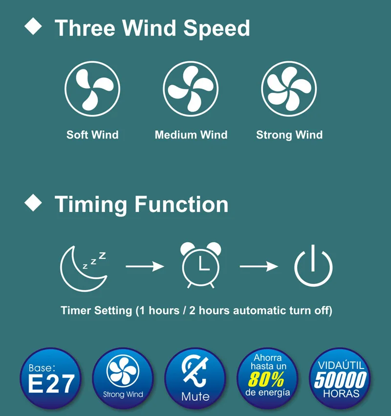 Featuring 3 adjustable wind speeds, dimmable LED lighting, timing function, and a sleep mode, BreezeGlow E27 combines powerful cooling with soft, customizable lighting. Control everything effortlessly with the included remote control, making it perfect for bedrooms, offices, and living rooms.