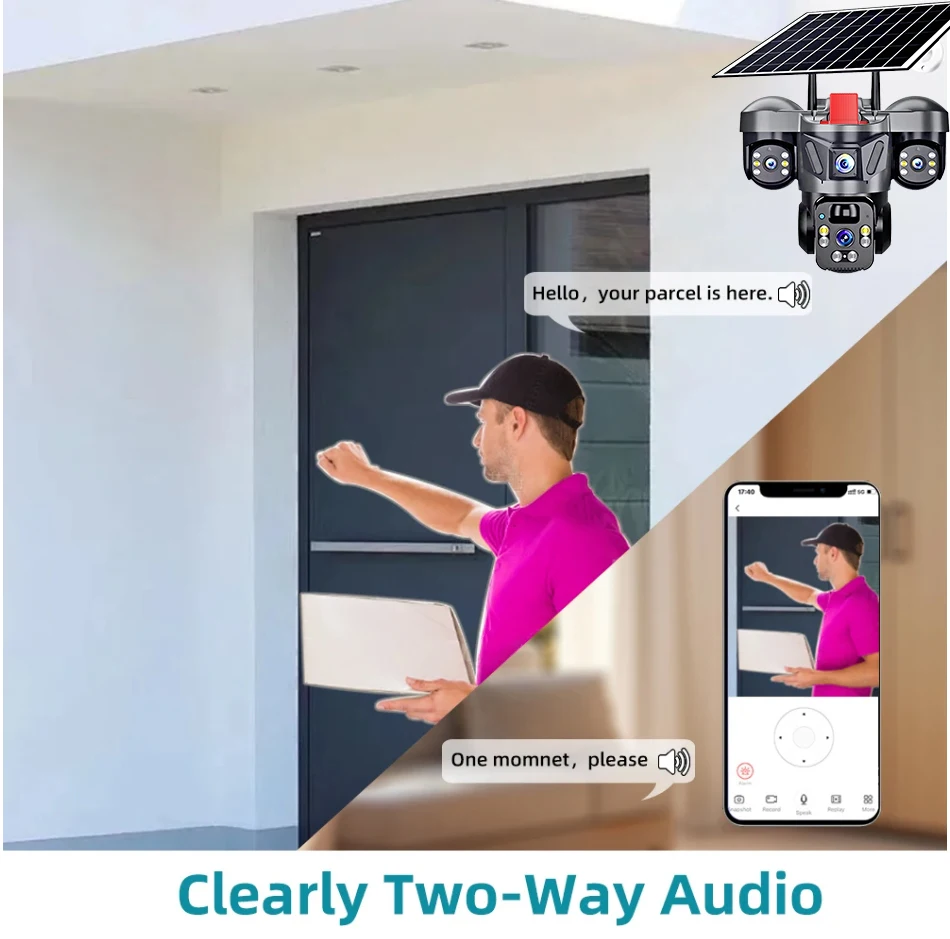 Works with 4G or WiFi, includes solar power + battery, motion detection, two-way audio, and IP66 weather resistance — perfect for any location without wiring.