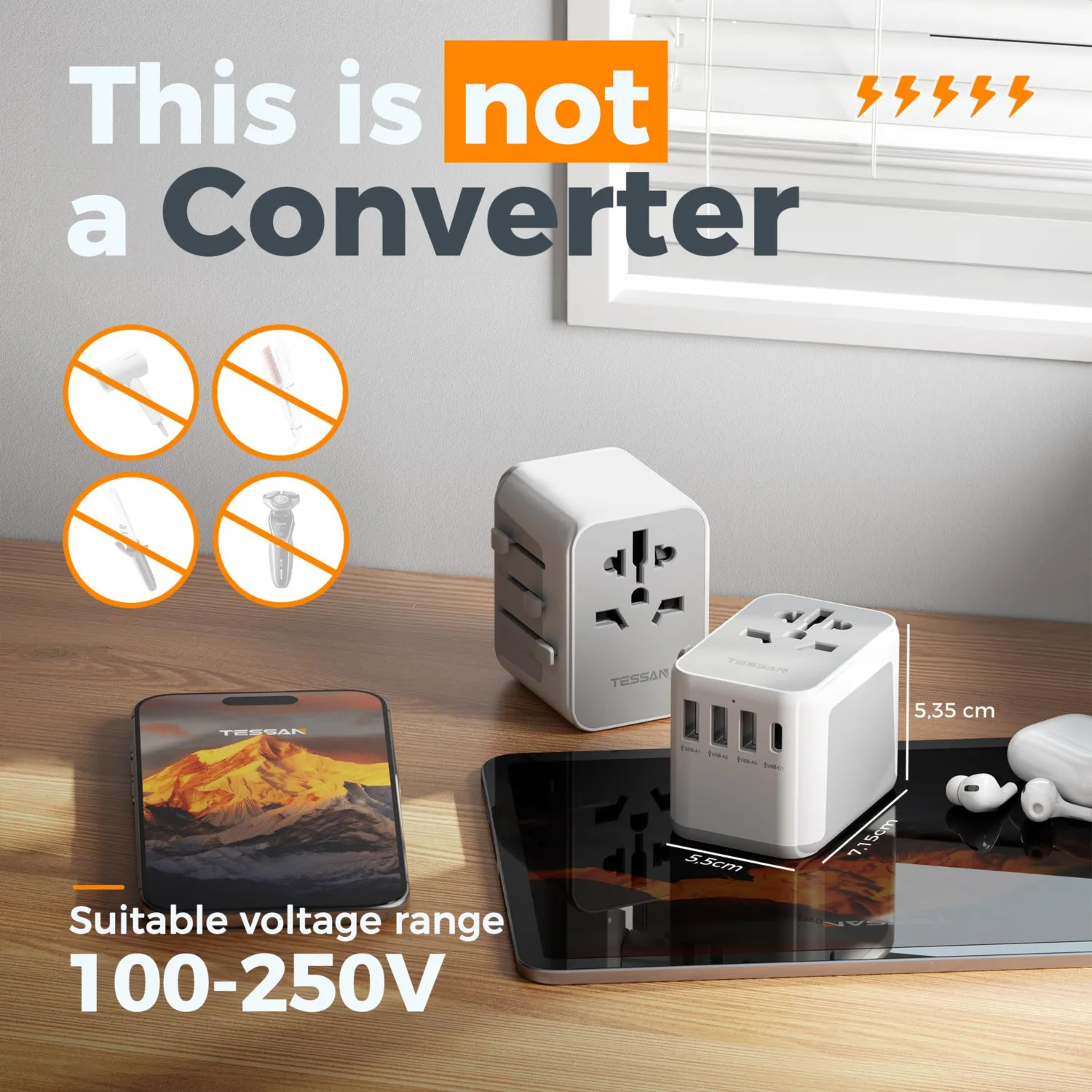 Thanks to the size of 7.15 x 5.5 x 5.35 cm, this international power adapter is compact and portable. The all-in-one entrance concept meets the diverse requirements on your trip and saves you plenty of luggage space without having to take additional adapters or sockets. It is also a USB home charger, even when you are not on the go.